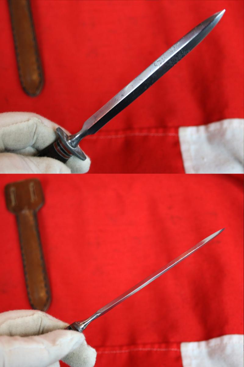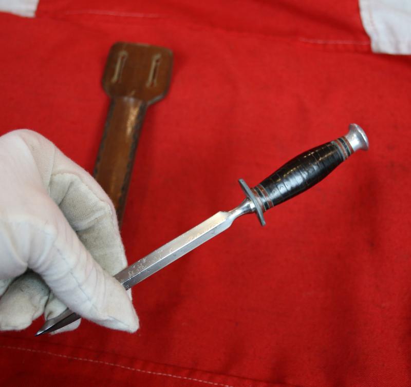 These stiletto daggers were designed to be carried by S.O.E agents who were dropped behind enemy lines as they could be concealed in a sleeve and easily accessed for close hand to hand combat or to take out an enemy sentry quickly. As with most items issued to the SOE they were not marked with any makers stamps in-case of capture.