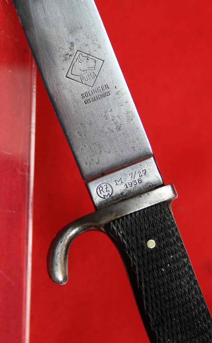 A Good Hitler Jugend Dagger 1936 By Puma {Coded M7/27} Blut und Ehre Blade. Scarce Transitional Early Period Dagger Which Bears Its Makers Name and RZM Code