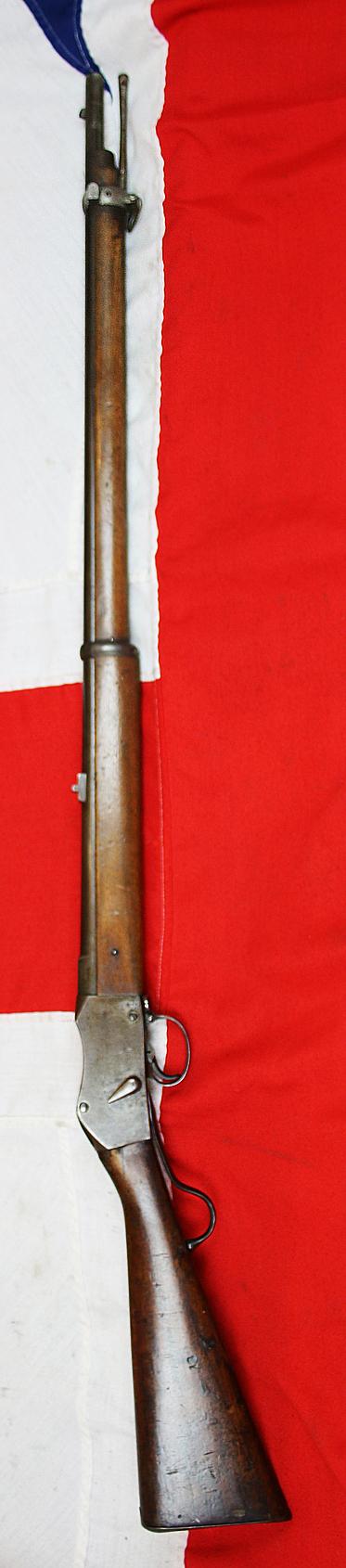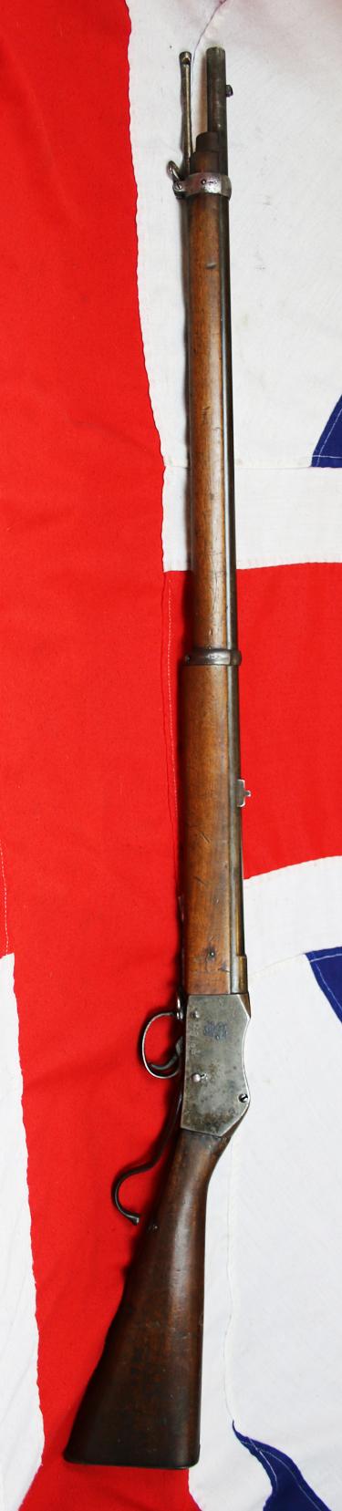 This Martini-Henry dated 1875, was the breech-loading lever-actuated rifle adopted by the British, combining an action worked on by Friedrich von Martini (based on the Peabody rifle developed by Henry Peabody), with the rifled barrel designed by Scotsman, Alexander Henry. It first entered service in 1871 replacing the Snider-Enfield, and variants were used throughout the British Empire for 30 years. It was the first British service rifle that was a true breech-loading rifle using metallic cartridges.